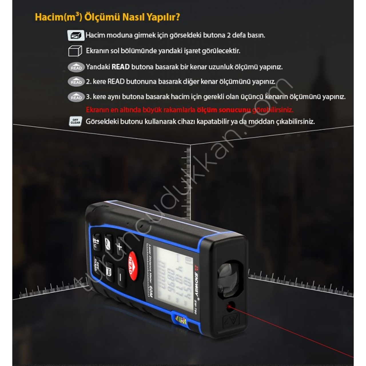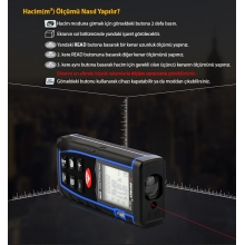 - SW-T100 lazermetre ile mesafe ölçümü, hacim ölçümü, alan ölçümü ve pisagor ölçümü yapılabilmektedir.