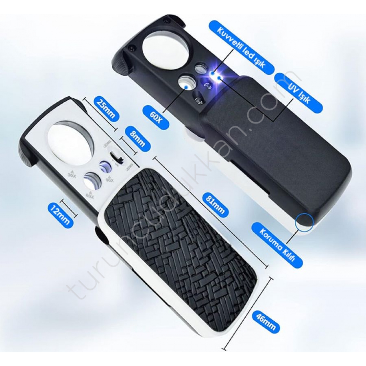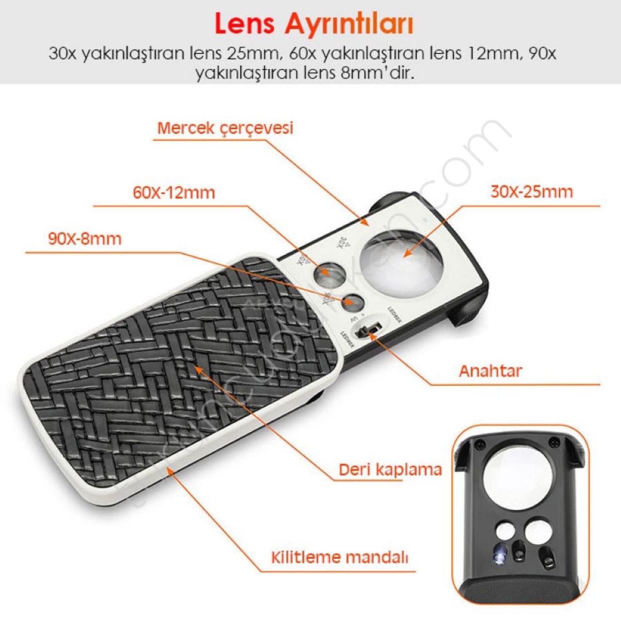 - Büyüteç üzerinde 2 adet beyaz led ışık, 1 adet de UV mor ışık bulunmaktadır.