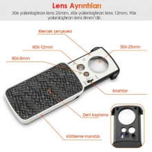 - 774 serisi büyüteç üzerinde hem fiziki hem de optik olarak farklı büyüklüklerde 30X, 60X ve 90X olarak 3 adet mercek bulunmaktadır.