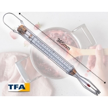 TFA 14.1032.60 analog şeker termometresi; tatlı severler için ideal bir yardımcı olan, genellikle meyveleri şekerleyip marmelat ve reçel yaparken doğru sıcaklık yakalamak için tencerelerin içine bırakılan metal çerçeveli bir termometredir.